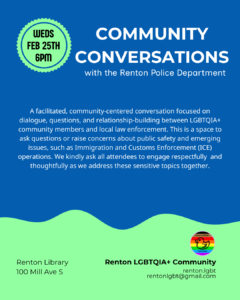 We’re looking for new board members! If you’re interested, email rentonlgbt@gmail.com or connect with a current board member. Expect about 8–12 volunteer hours each month. It’s a wonderful opportunity to grow your leadership skills and give back to the community.